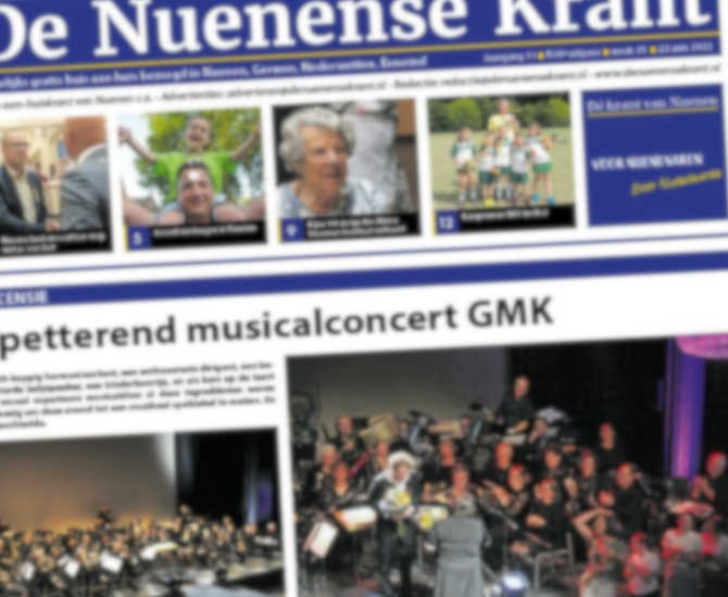 De Nuenense Krant valt wekelijks gratis op de deurmat in Nuenen c.a., inclusief de buitengebieden. Een full color krant voorzien van het allerlaatste (gemeente-) nieuws uit Nuenen, Gerwen, Nederwetten en Eeneind. Behalve nieuws leest u in de krant ook interessante verslagen, verenigingsnieuws en columns. Wilt u adverteren in de Volkskrant dan kunt u profiteren van de aantrekkelijke kortingen van de Advertentiegroothandel. Het plaatsen van een advertentie in de Volkskrant was nog nooit zo goedkoop en gemakkelijk!