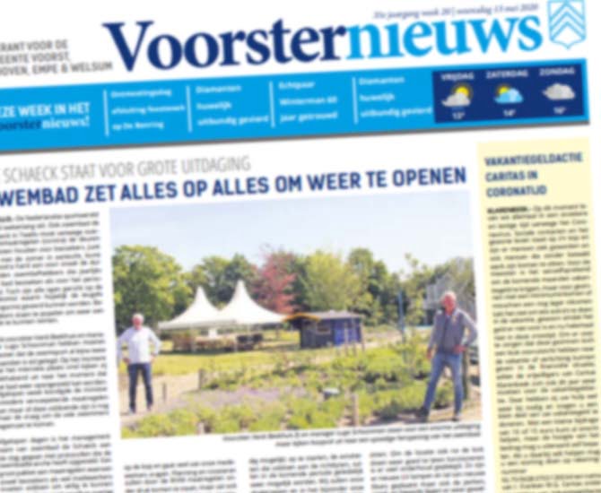 Voorster Nieuws is dè huis-aan-huis krant in de gemeente Voorst. Wekelijks wordt deze krant gratis bezorgd met daarin het laatste nieuws maar ook alle informatie over komende activiteiten, evenementen en bijzonderheden. Tevens staat er wekelijks het gemeente nieuws in. Naast dat de krant op de mat valt, is deze ook digitaal in te zien op de website, net als de actualiteiten. Wilt u adverteren in Voorster Nieuws dan kunt u profiteren van de aantrekkelijke kortingen van de Advertentiegroothandel. Het plaatsen van een advertentie in Voorster Nieuws was nog nooit zo goedkoop en gemakkelijk!